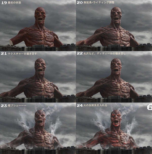 今作品のメインともいえる巨人です。3Dデータのままだとテカテカしすぎでライティングも暗いのでスケール感を感じらないのでテクスチャー素材や、ペイントでディティール足していきます。