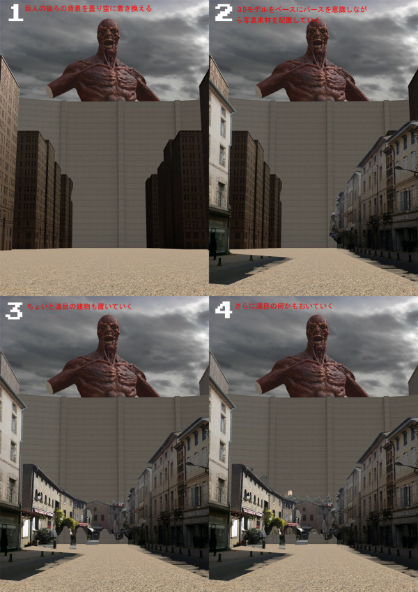 次に质问がいっぱいあった立体机动装置ですが、これはいわゆるコラージュ的な手法です。ジェットエンジンやよくわからない物のを组み合わせ、ライティングを合わせていきます。ハリウッドSFチックを目指してます。