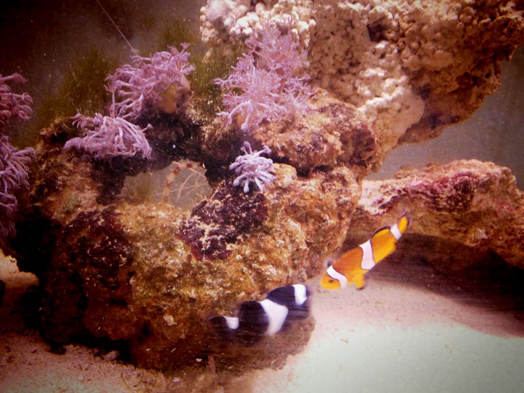 橙色小丑是从另一缸中放到这缸里的。和黑白小丑一样,都是幼年丧偶。。。木有钱买新的配对。今天就把他们放到同一缸里了(200L垃圾缸)