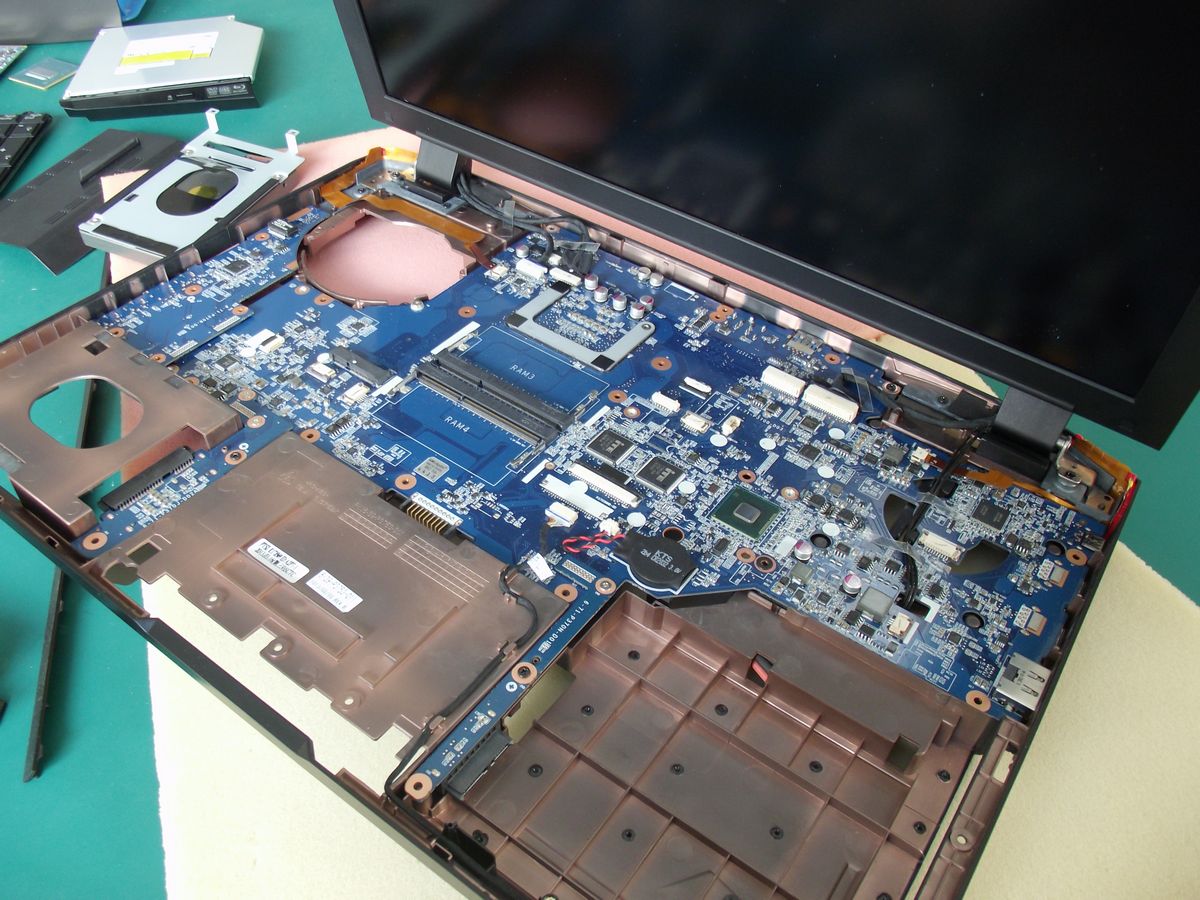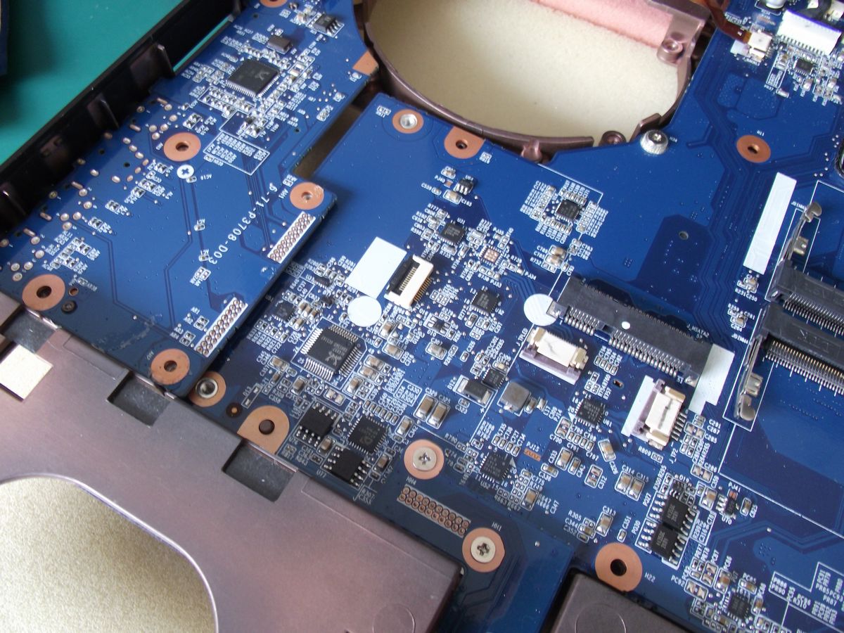 P375SM笔电后盖板有两块,一块是放置硬盘的,另一块……,大家一看就明白,如下图所示,拆开后盖,基本上笔记本电脑的内部架构是一目了然了……