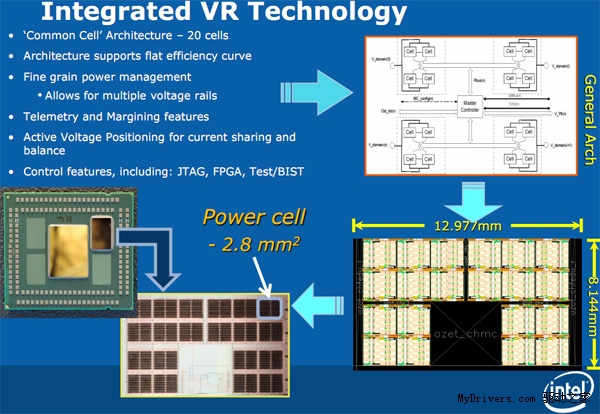 Haswell处理器在内部整合了FIVR电压调节模块,这一模块在此前都被整合在了主板上,而Haswell则把它收回处理器内部,如此一来虽然增加了处理器的晶体管数量,但相对来说能让处理器内部的电压控制更加精准,电流也更加稳定,供电效率更高,理论上能够提升Haswell处理器的超频能力。 对主板的好处就是能够简化CPU的外部供电设计,能效控制起来更方便了。按照Intel官方的介绍,每路Power Cell支持25A的电流,并且每个Power Cell支持16相的供电,一颗完成的芯片最高可以容纳320相供电。
