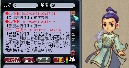 刚上线,看到几个人发来信息,三月份的,要求PK,说了很多脏话,我也不知道那贱货到底做了什么恶心人的事,惹来这么多事。反正不管怎样,楼主是号的主人,楼主得负责人,楼主向那些人发信息道歉。