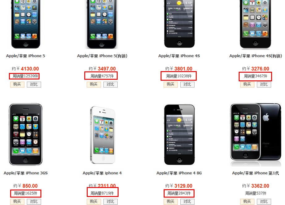 水果果然不是盖的。就三款机型。周销量4W+。 水果5周销量12539+4757, 水果4周销量2W+,单价就不说了,一脸泪。尼玛现在3GS还有人买,周销量都能到1625. 这果然是世界第一水果啊。 华为你在哪啊