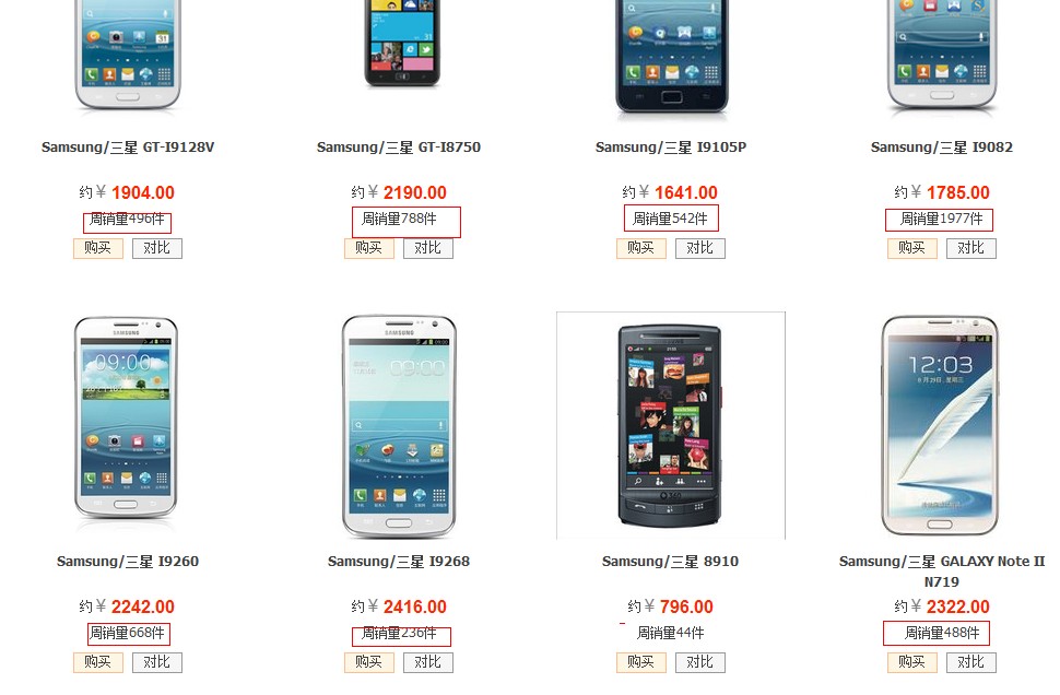 果然没落了。。就one能撑下场面了。 还有个HTC S720e G23 One X,也能卖到周销量2429件,单价2538,这里我就不贴了。和当时三星苹果一条阵线上的,现在是差远了。