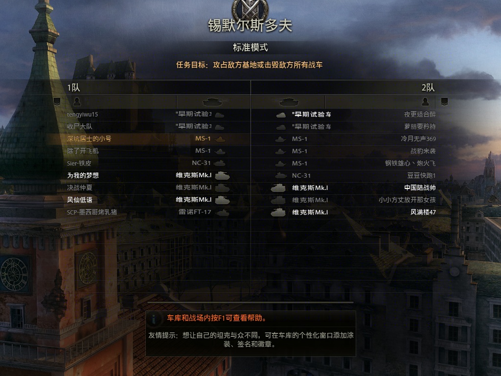 前一段时间开38h进了这种房间,两边都6个人,除了我全是1级车,我开场白字:你们投降吧