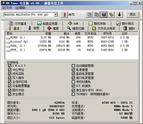 另,硬盘标签上印的是TOSHIBA 500G 7200转,但是现在HDTune检测是MARSHAL 640G 5400转,没想明白这到底是祸是福。。