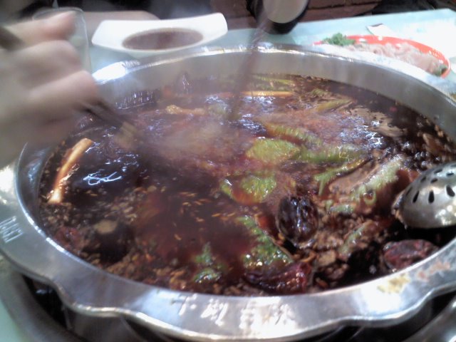 我们那边的火锅是这样的说 红红的 才对味~! 上面漂了很多花椒之类的 大爱啊~!