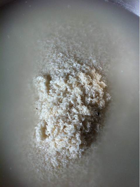 把江米用冷水跑泡两个多小时,我们准备的还有糯米。