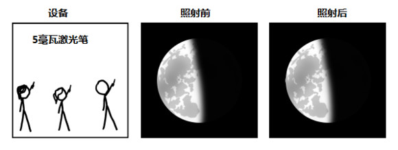 假设所有人都能够稳定的瞄准,所有的光都能平均的分布在月球表面。在午夜过半小时的时候,50亿人在同一时间按下激光笔的按钮