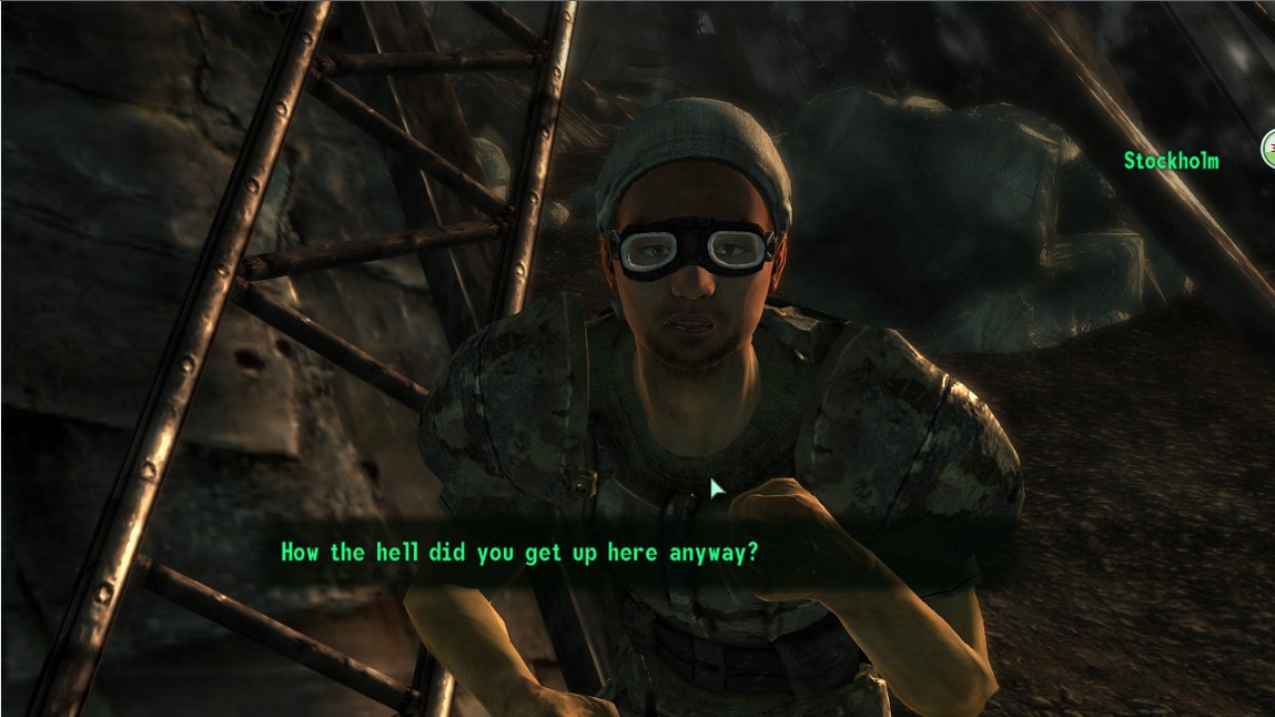 额,这是楼主今天晚上蛋疼的发现的结果。起因是断钢dlc完成圣水任务后门口的3个抢水2B,当时发生火并时我清晰地听到了数声狙击的声音,循声而望就发现了这位大哥,于是一个邪恶的想法就产生了,经过数次实验后,终于成功地把他“请”下来了。