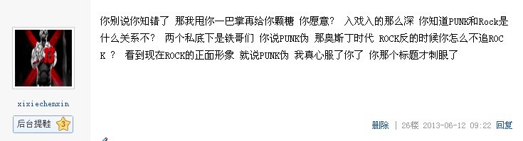 这算什么,前些日子有人公然在PUNK吧这个吧骂朋克,可恶吧主还没有删,还。。。