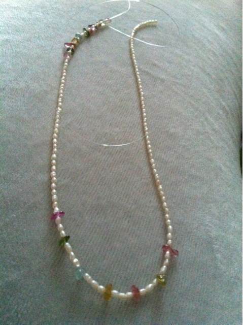 加了颗橄榄石坠子在锁扣处。第一次绕线串石头,手艺差啊,好在自己戴无碍啦啦啊啦!