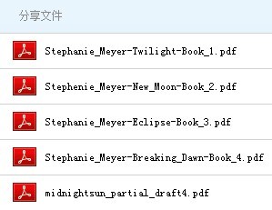 今天刚刚弄清网盘怎么用,分享pdf版的原作还有未出版的midnight sun。这是唯一一套能让我熬夜看的小说,太喜欢了。自从看了第一部电影,觉得太不过瘾,就买了4本书来看。看完书还是不过瘾,又去找了pdf放在手机里。