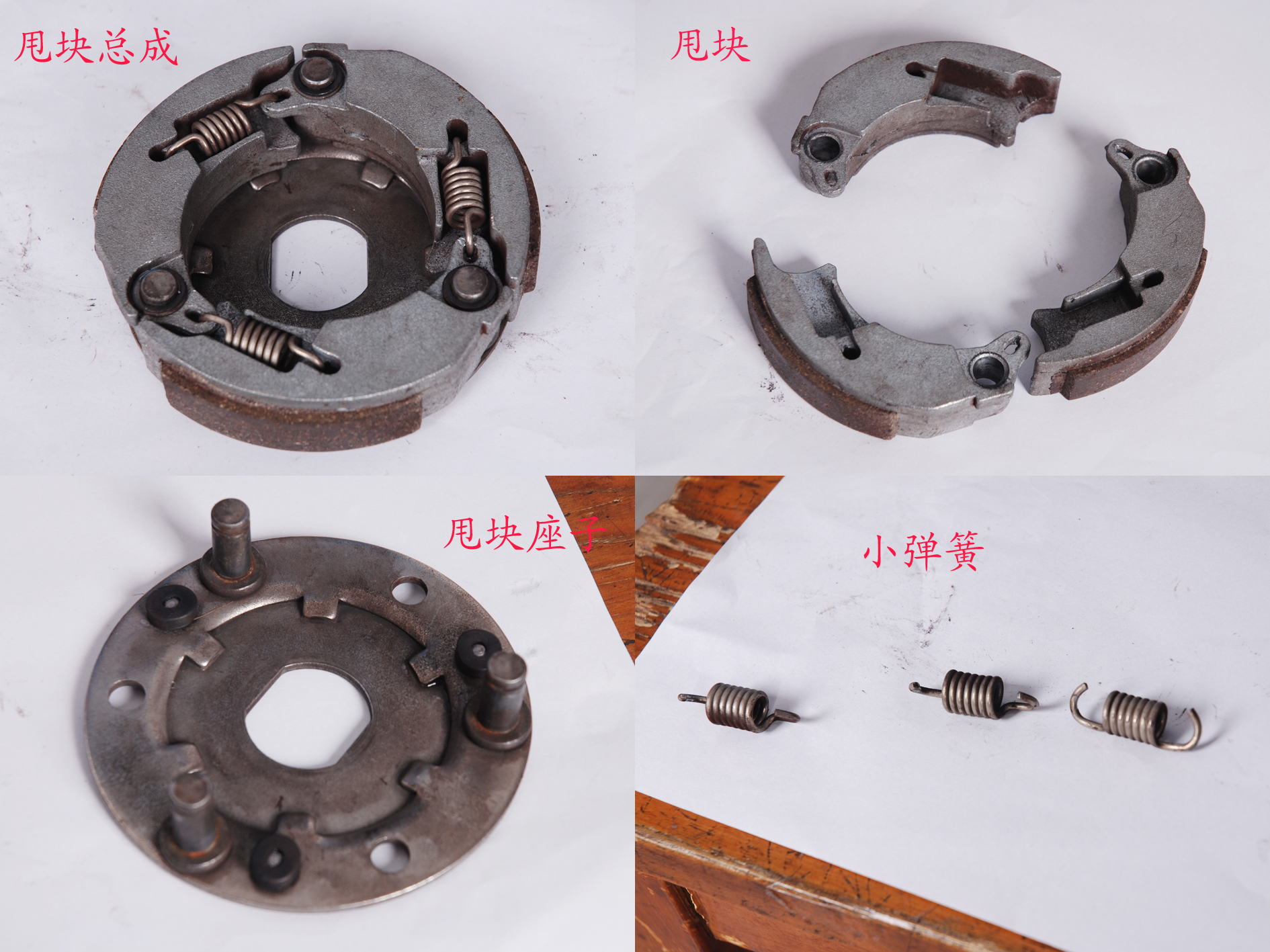 普利盘分解图。六个普利珠装在普利盘6个滑槽内,轴套套在曲轴上,皮带扩张和收缩普利盘可以横向滑动。发动机转动后普利珠被顺着滑槽甩出去,普利盘压板挤压普利盘,皮带会向外延张开,到一定转数后,普利珠被甩出的离心力克服离合甩块小弹簧的拉力,甩块与宛公接触车子就被带动