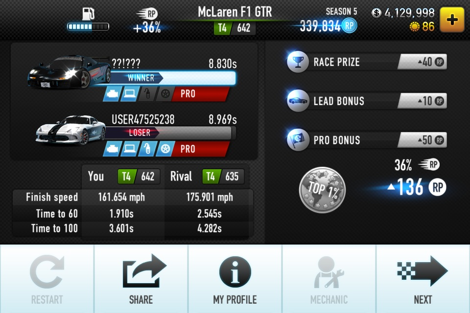 我来总结一下,是这样的。不要P起步,最好在5700转到5800转起步,然后等指针跳过换挡时机,刚出现late时放氮气,然后注意指针会很快转动,一定要快,后面可以P也可以good,相差最多0.01秒。成绩稳定在8.840以内。上一张图,有压力就有动力!