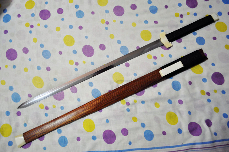是驼骨做的剑装,唐刀以华丽著称,但是手残啊,做不出装具来,只能素了,呵呵。条子是用弓子板锻的。性能还是很不错的,硬度58—60,韧性宝剑可以做到90度会弹不变形,刀太厚了,没试过,哈哈~~