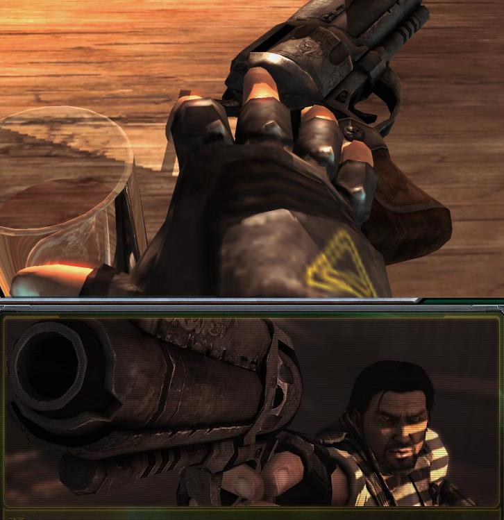 想了几个解释, 雷诺的路战服和别人不一样,用的是包指手套?或者雷诺的手枪孔大, 容得下路战服的指头, 难不成雷诺有两把手枪, 一把型号小, 裸身使用, 一把型号大,穿战斗服时使用??!!