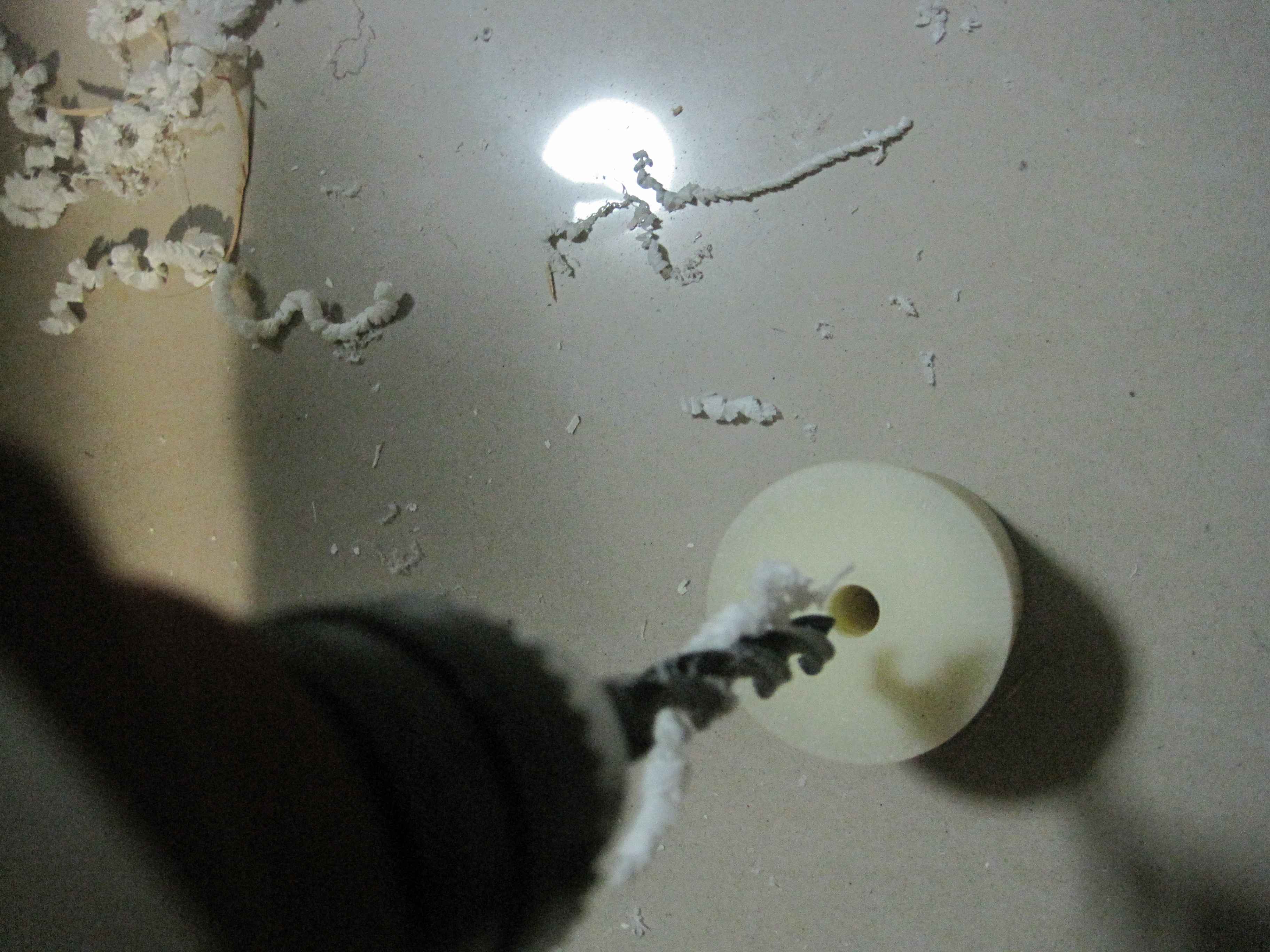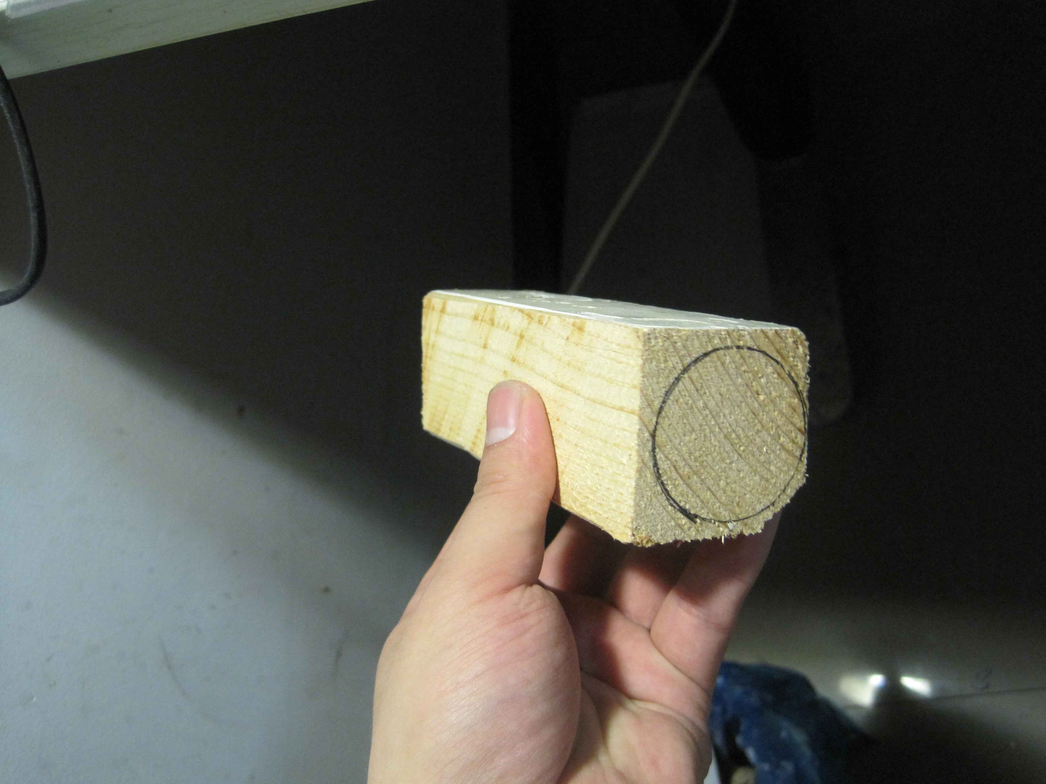 最精彩的步骤来了----手工制木柄,半夜了,用车床会死人的,干脆手工做吧。首先选料,选了一块干透的松木,木材是去年收的几根拆下来的窗户框子。用厚垫片比着划定切削线。