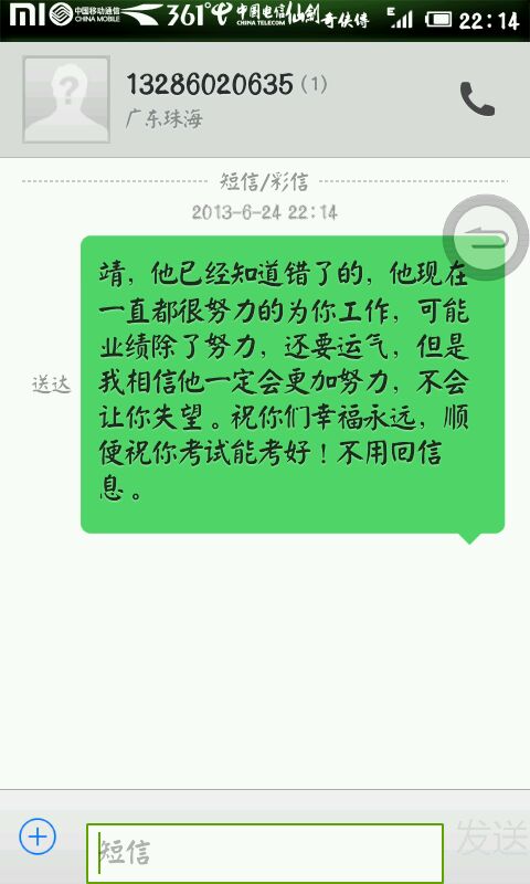 靖,他已经知道错了的,他现在一直都很努力的为你工作,可能业绩除了努力,还要运气,但是我相信他一定会更加努力,不会让你失望。祝你们幸福永远,顺便祝你考试能考好!不用回信息。