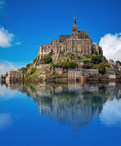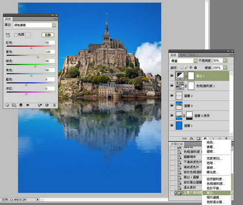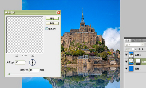 的「圣米歇尔山Mont Saint Michel」,去过的人都知道那里有道桥,但如果你想改良成一张有如独立在海上的小岛,就可以参考以下做法。 1) 将版面尺寸向下增加一倍。