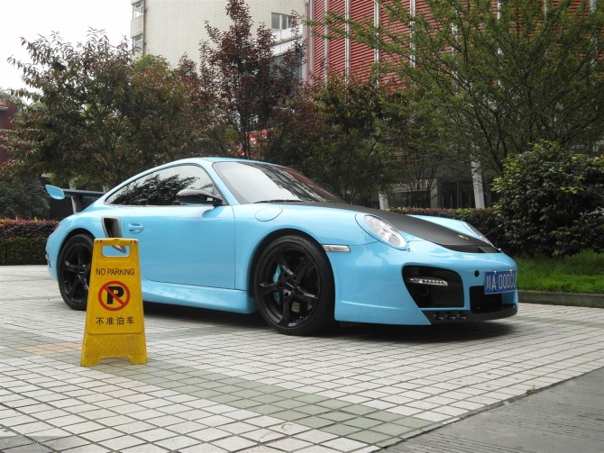 这是一台套件改装的保时捷 911 Turbo,