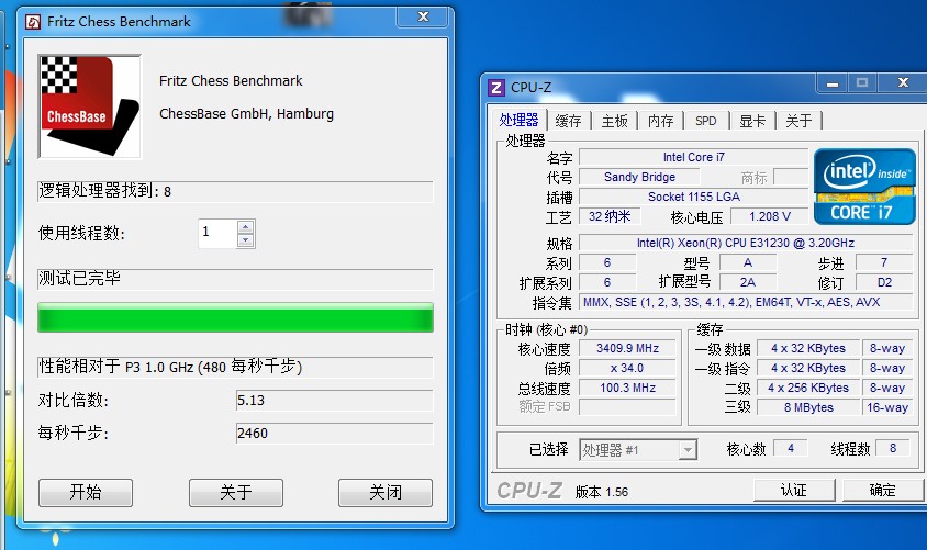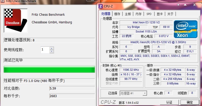 本次评测用的是跑象棋的单核性能,使用的CPU是E3和8350的默认状态,两U默认都是开启了睿频的,E3的单核睿频提升的幅度比8350还大些从3.2提升到3.4 8350从4提升到4.2