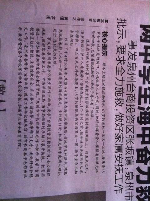昨日下午4时30分许,在台商投资区张坂镇前见村海域,两名学生为救一名社会青年被海浪卷走。昨晚,被卷走的林洪先和社会青年先后被救上岸,但均不幸遇难,另一学生失踪。林洪先初一在南安实验中学就学,初二转到了秀江中学就读。生者坚强,逝者安息。