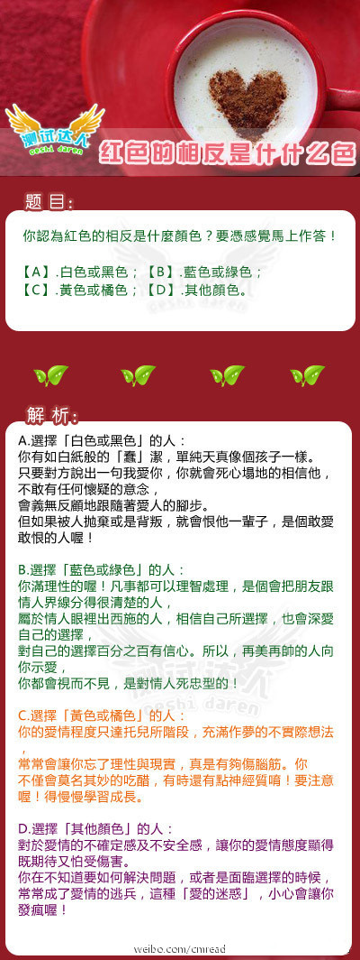 【你认为红色的相反是什么颜色?】这个小测试能测出你的爱情观和你的个性。你认为红色的相反是什么颜色?要凭感觉马上作答噢!