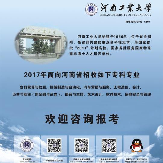 欢迎第一志愿报考河南工业大学专科专业!2013年招收机械制造与自动化、金融与证券、商务英语、食品营养与检测、工程造价、会计6个三年制专科专业,计算机网络管理、计算机信息管理、图形图像制作、软件技术等4个两年制专科专业。报志愿时间7月6-10日,欢迎咨询0371-67789999、67789888。