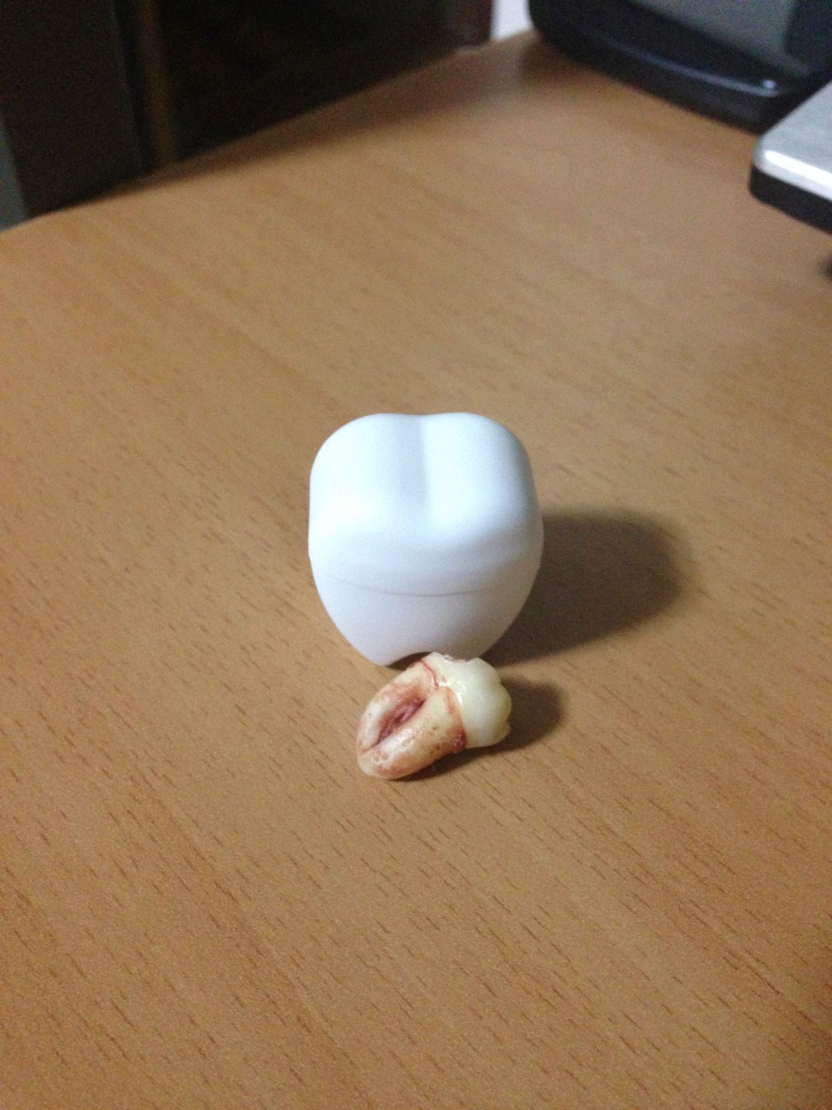 好大一颗,我还以为我的牙就够大的了呢。话说牙医很贴心啊,还送个盒子?楼主你压根很深,不用担心老了掉牙齿了~