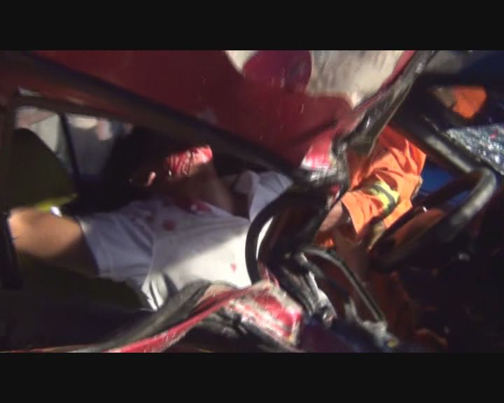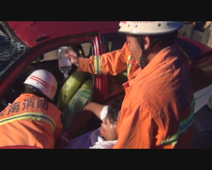 救援官兵抵达现场时,公路两边已经围满的许多群众,现场一片狼藉。经初步勘察,一辆车牌号为云HF1360的直行皮卡车以一辆车牌号为云HT1543开往八寨的红色出租车相撞,当时,由于下着小雨,路面湿滑,车速过快,酿成了此次交通事故。皮卡车驾驶员轻微擦伤,出租车车身严重凹陷,玻璃已经全部碎裂,洒落一地,车内受伤两人,其中驾驶员已被送往医院救治,副驾驶乘坐人员被卡在车内动弹不得,并且失去了意识。20时12分,指挥员下达作战命令。经过3分钟的紧张救援工作,