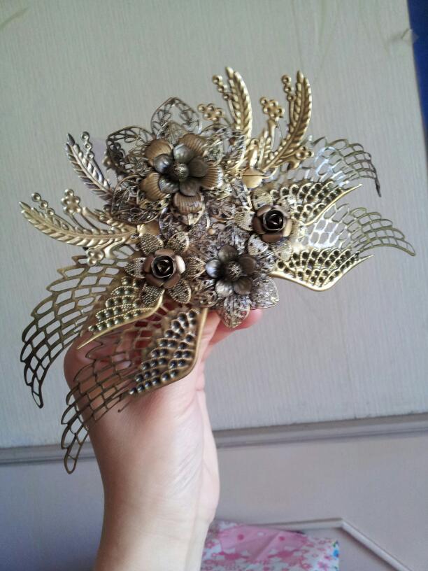 忘了带打孔钳了,本来是要给底下6瓣的花托打孔后,用T针固定的。现在就只好用铜丝穿好后,穿过垫底花片拧紧固定。