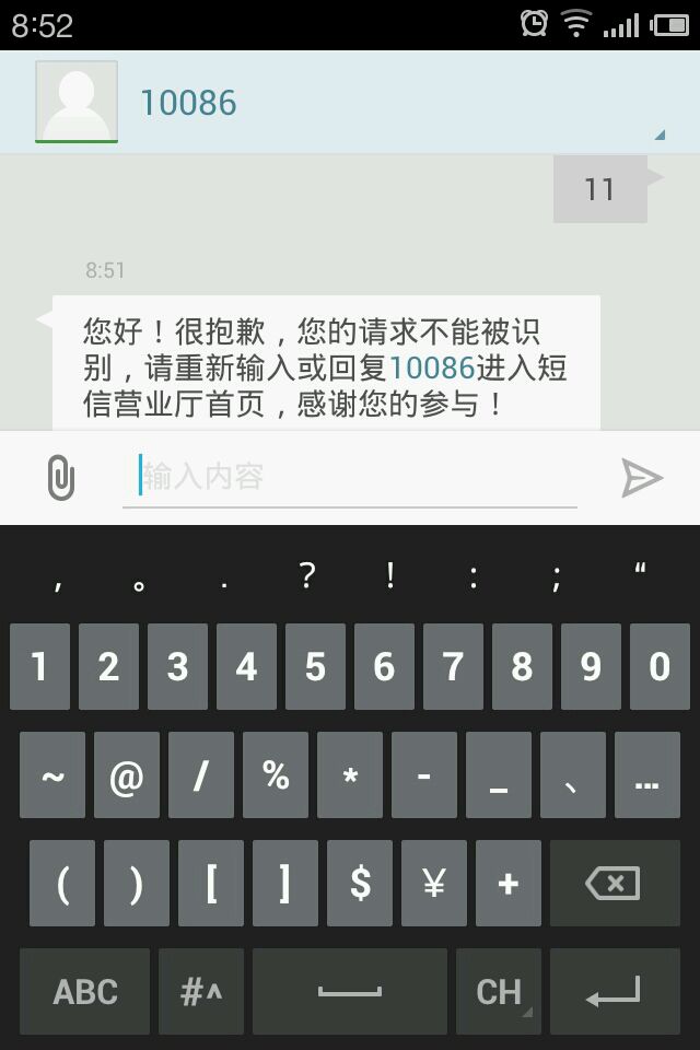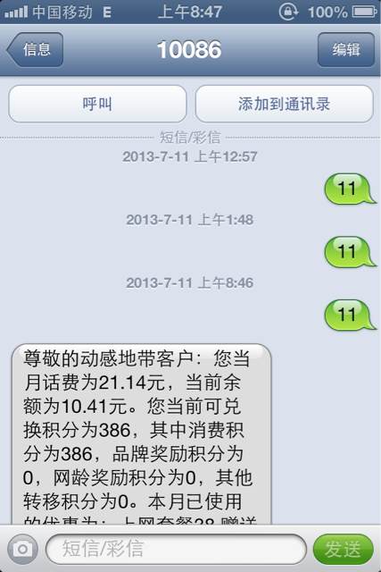 给10086发短信查话费发了三次才给我回复,连10086都不好儿搭理我了,更别说别人俩