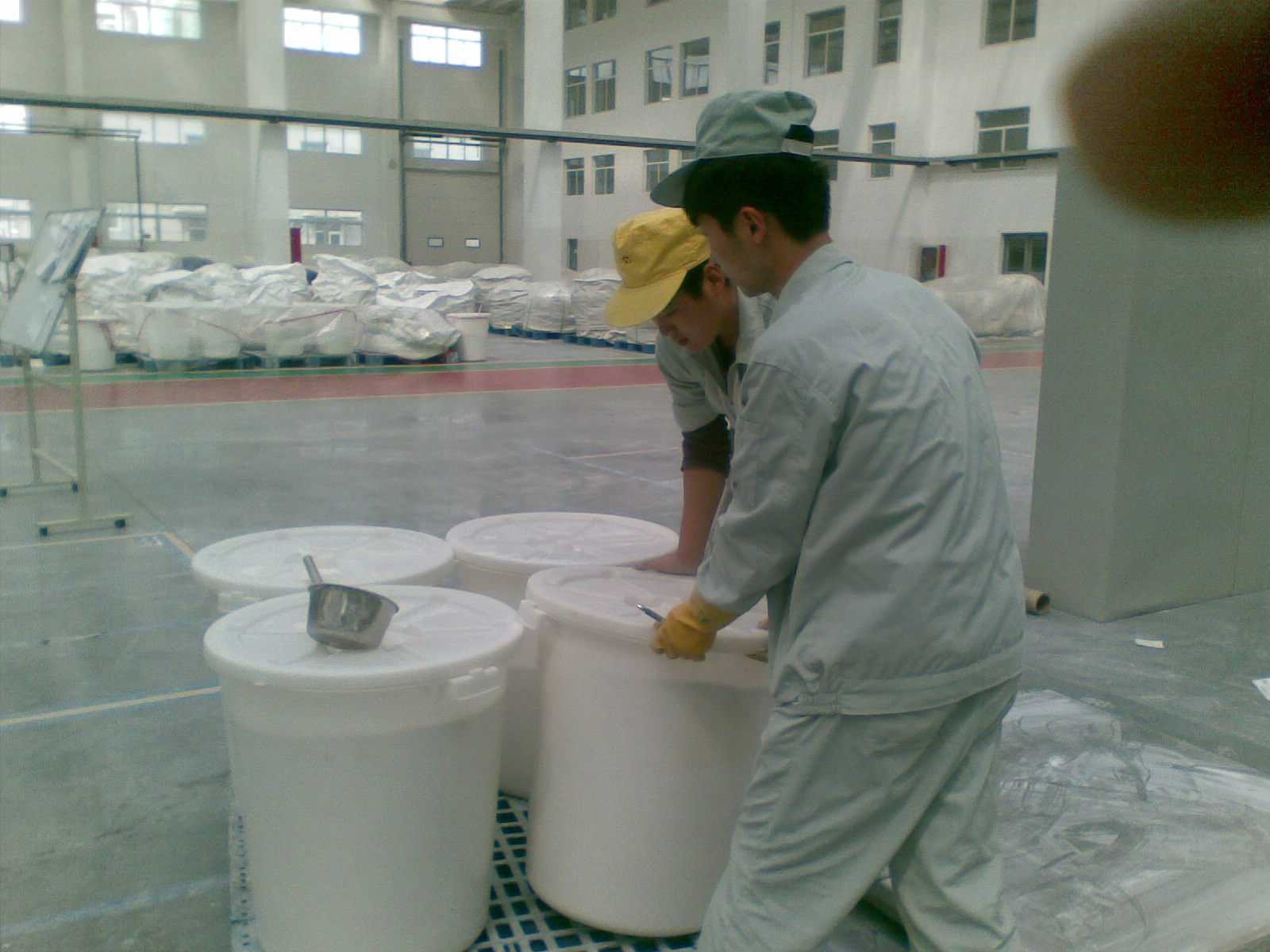 这样一个大白桶要装100kg的“料”(公司里的统称)