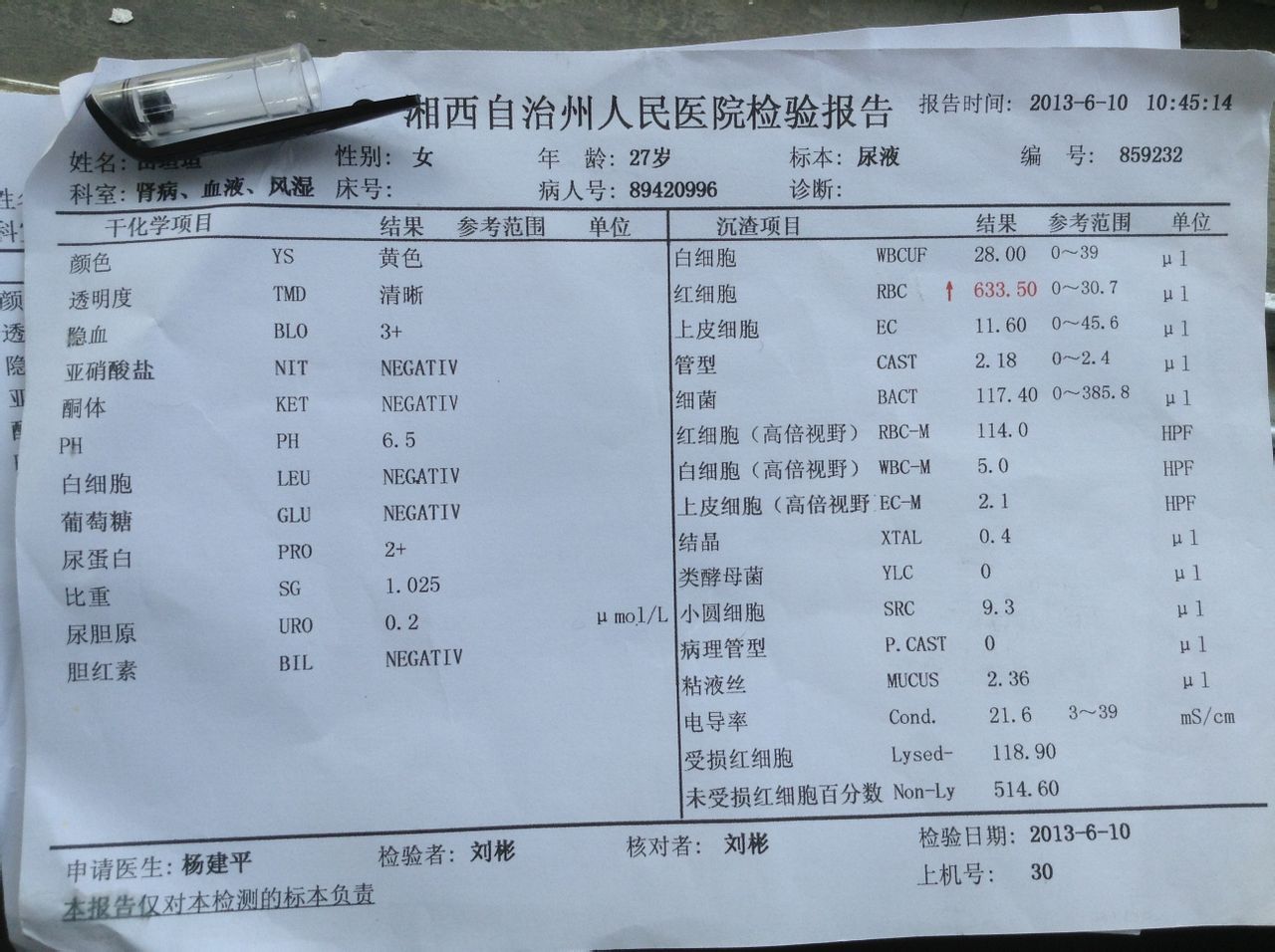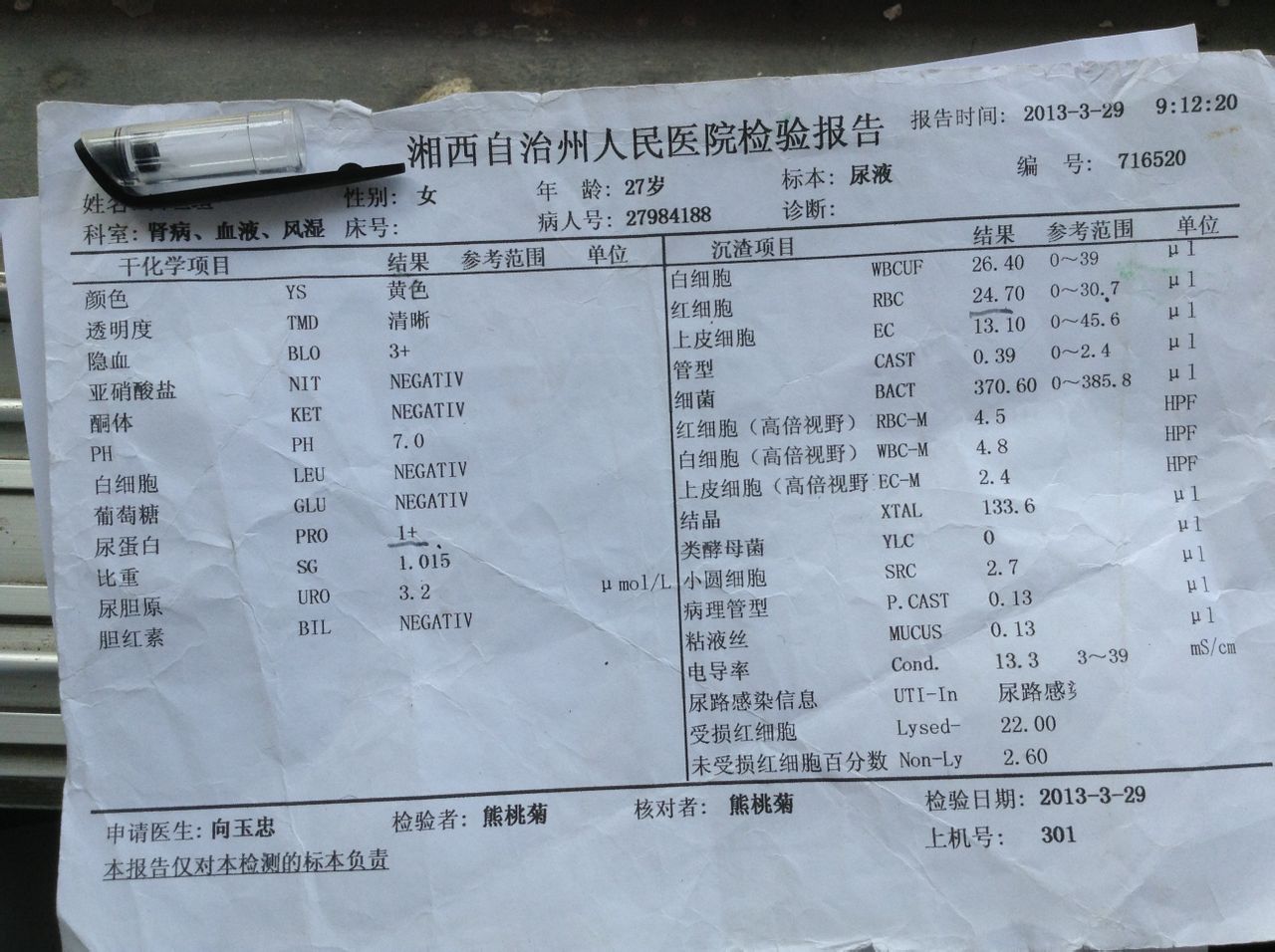 楼主,你的蛋白有点多,,吃代文再加个黄葵吧!裸花紫珠消潜血的,,我从几百到几十了,,妈的,今天去重庆的医院没卖的,我上次是在武汉军总开的,,消红细胞还可以,,真的