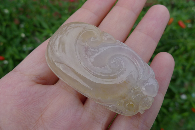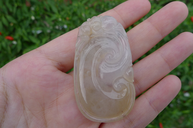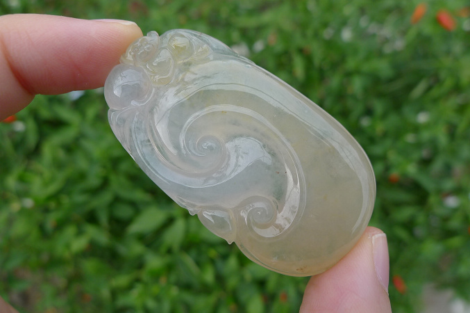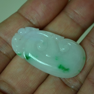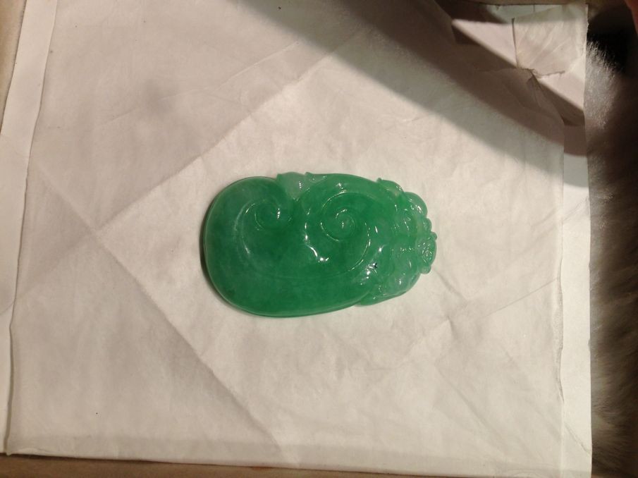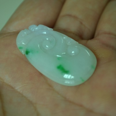 满绿如意,色艳,雕工精致,上身效果好,完美无纹裂,8000元包A带证书,三天内无条件退换货。尺寸:40*25*6mm