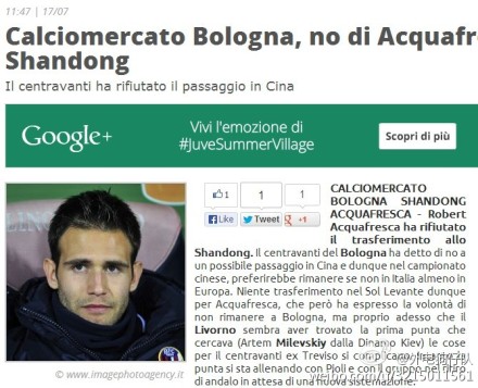 意甲博洛尼亚前锋、前意大利国奥队成员阿夸弗雷斯卡拒绝了山东鲁能的邀请,因为他想留在欧洲踢球