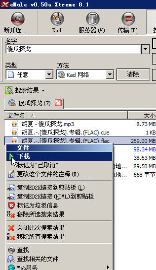 如下图所示,搜出资源后,在你想下的资源上点鼠标右键,在弹出的右键菜单中,把鼠标指针移到“下载”两字上,电骡就会开始下载