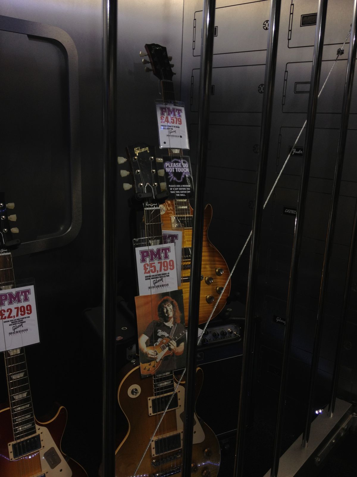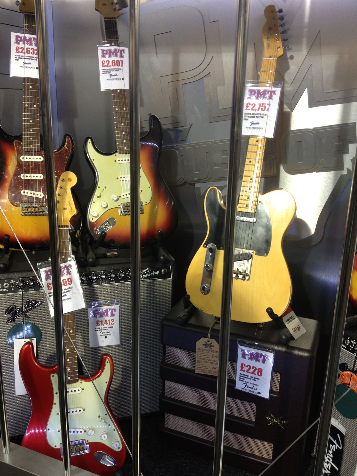 PMT=professional musical technology 进门右边是柜台收银台,上面有很多配件。左边是一排吉他挂架,一条直道到底。从fender开始squire,gibson,epi还有Ibanez,后面就是贝斯。在这排吉他前是卖架子鼓电架鼓为主和key board