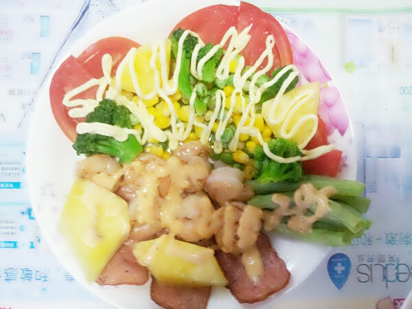 主料有培根,大虾仁。配菜:番茄西兰花玉米甜豌豆豆角菠萝。沙拉酱和千岛汁。成本在35左右,都选得好料哦。都乐菠萝伤不起。