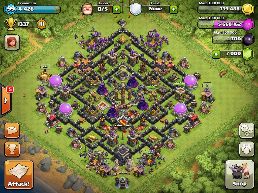 原理先说到这里,下面附上默认/样板阵。鄙人目前9本正在用该阵打金(低杯段)。之所以说这个阵是多功能阵,在于它不需要改变任何墙的位置,却能通过变换建筑的位置来达到不同的效果。我会把能想到的衍变阵型一一列举出来,并附上每个的优缺点,以及适用范围。