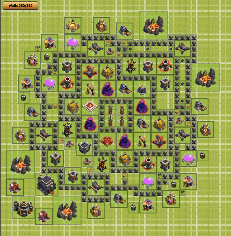 首先点评一下样板阵,此阵里有13个2*2的空间(可放置电塔以及大炸弹,甚至国旗和雕像),8个陷阱缩颈(可放置弹簧),3个战略缩颈(聚兵,使得aoe防御最大化)。