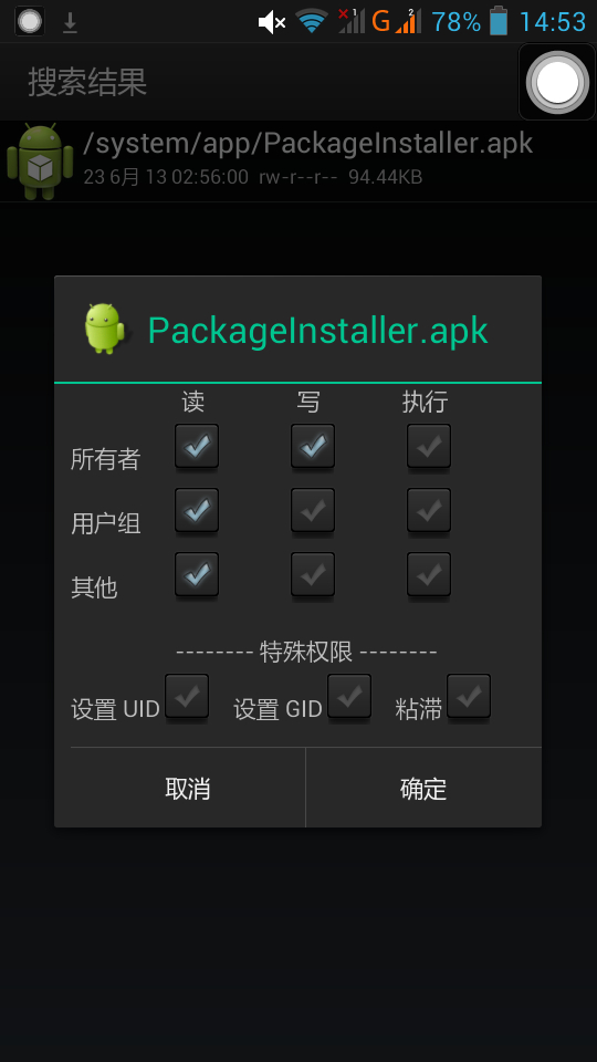 然后打开RE管理器→进入sdcard→找到刚才的PackageInstaller.apk复制→进入system→点击右上角更改权限为读写后粘贴→ 一直按住PackageInstaller.apk选择权限,