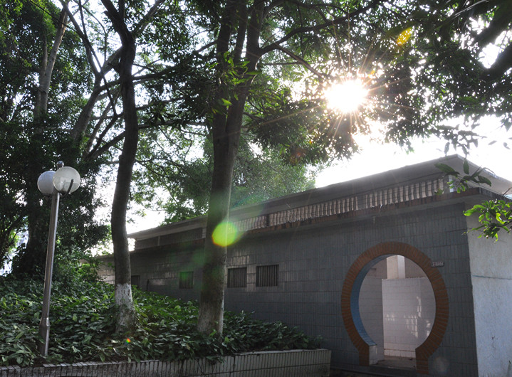 顺着板报栏旁边的路往前走,就是该校区的公共厕所。