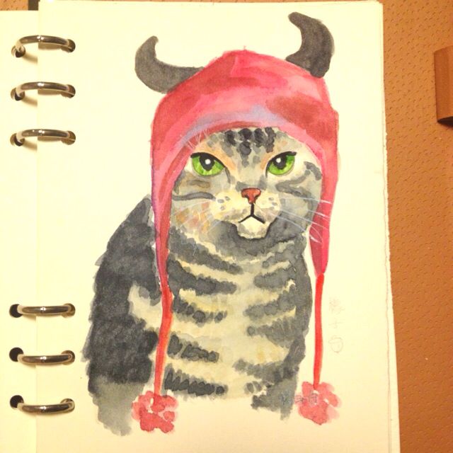 这个猫的铃铛虐死我了 第一次画脏了 就用樱花白色和白夜的不透明黄色遮盖 感觉都要成水粉了 最后的效果貌似挺上照 错觉吗?