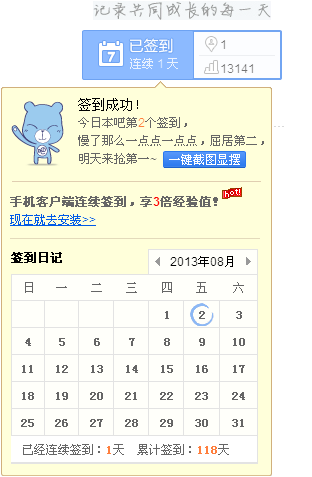 连续在本吧签到1天,晒下签到排名照,看看我神马水平