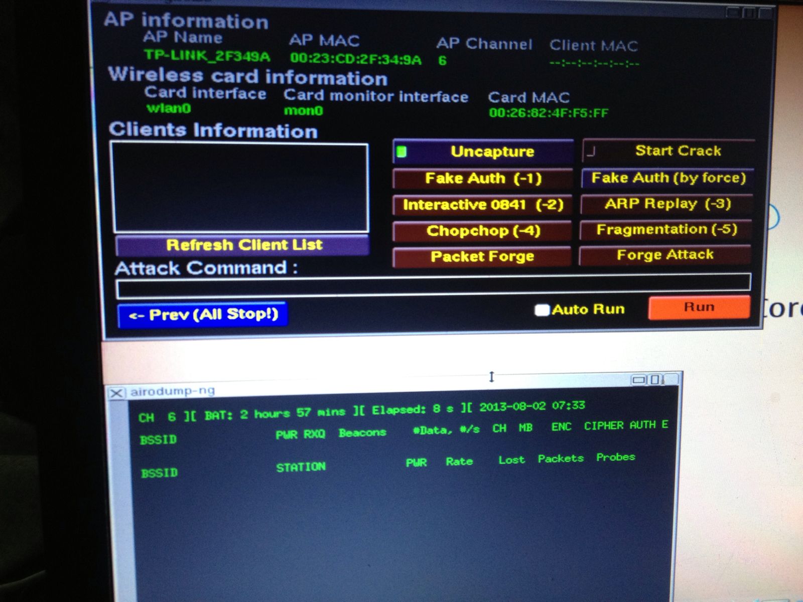 wep加密的,图片上这个没搜出客户端,不过我搜出过客户端,但是点击完攻击按开始后,一直没见跑数据,就跟图上那个显示的一样,请问下这到底是什么原因?