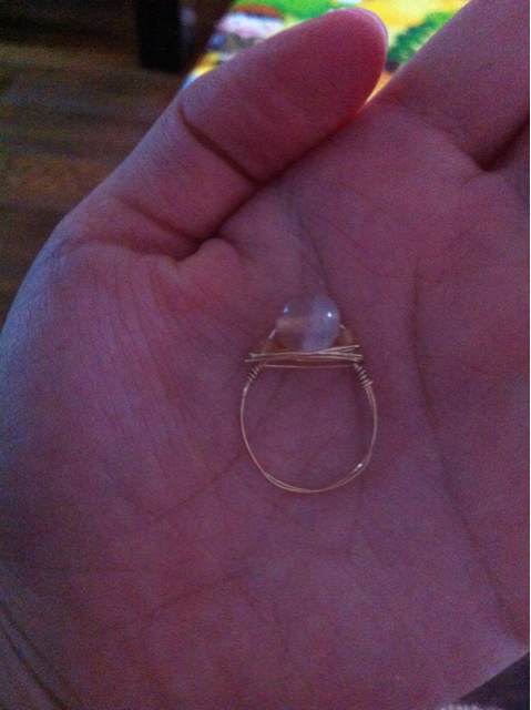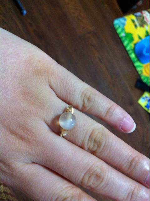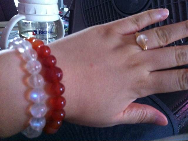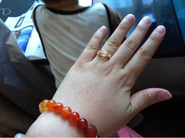 拆了一颗有小裂的珠珠,加了一个玛瑙玫瑰圆珠。再用这颗有裂的小玛瑙珠子练习绕线,当当当当,第一个绕线玛瑙戒指诞生!有点丑丑的,但是还是很喜欢,刚好搭配着一起戴嘿嘿!
