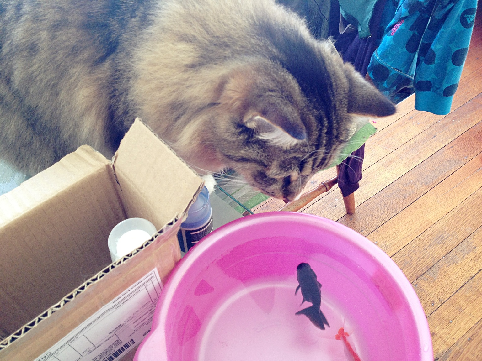 到家了之后,我妈,奥利奥和起司,一起围上来看,我妈不住的赞叹,确实挺胖乎的挺欢实的。我看我妈情绪挺好,说不定一会我那单反相机还能回来,于是为了增进友好气氛,我问了一个问题,妈,你还记得这种没有背鳍的鱼是什么品种吗?
