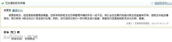 亲爱的 海沙2O11:亲爱的吧友,经百度贴吧管理组调查,您所举报的吧主在日常管理中确实存在一些不足,我们会在近期内加强对吧主的监督和引导,若吧主未能改善现状,我们将按《吧主协议》规定进行处理。同时,也欢迎您与我们一同对吧主进行监督,感谢您对百度贴吧的关注与支持,谢谢。 处理人:百度贴吧管理组 2013-08-08 14:03 投诉 海门 吧